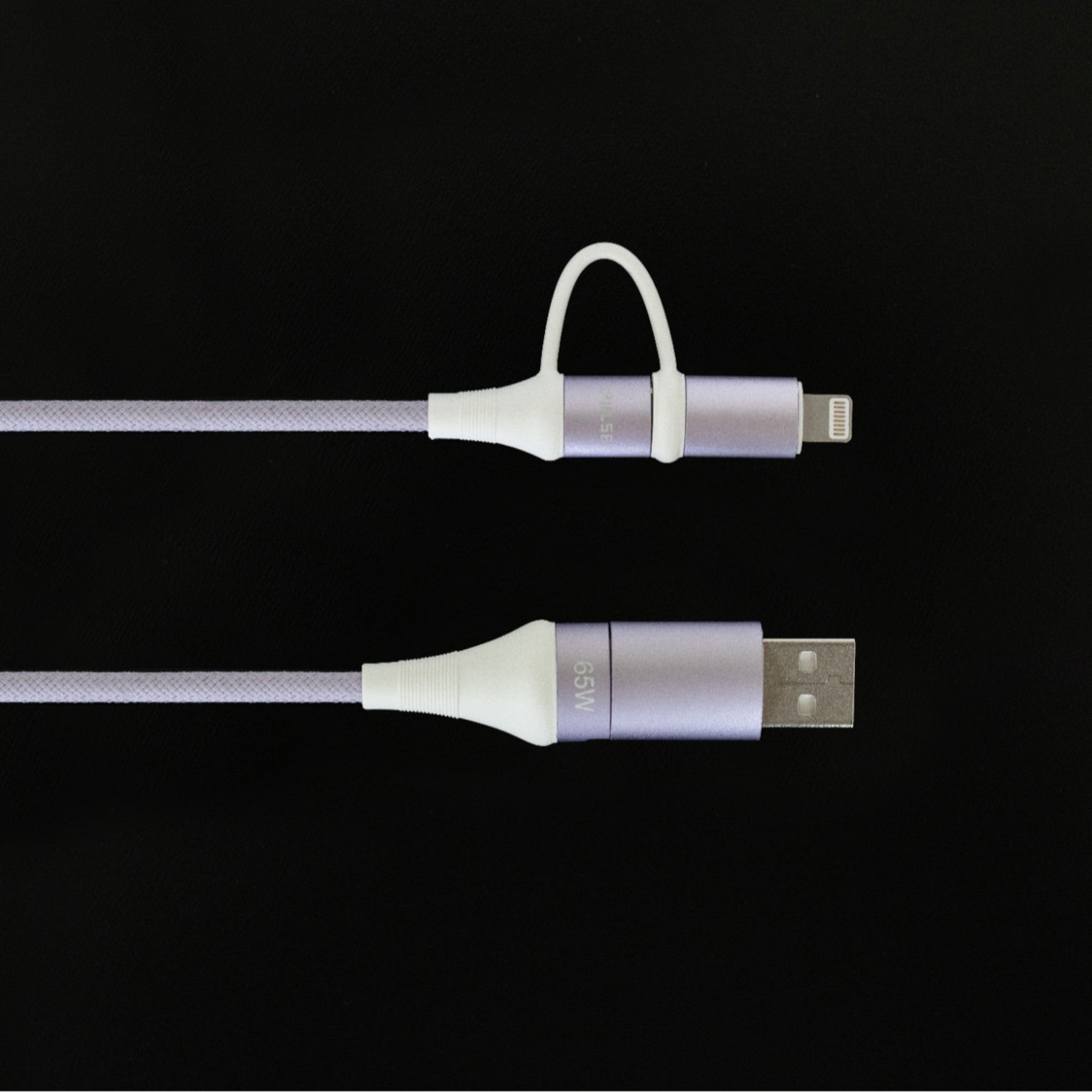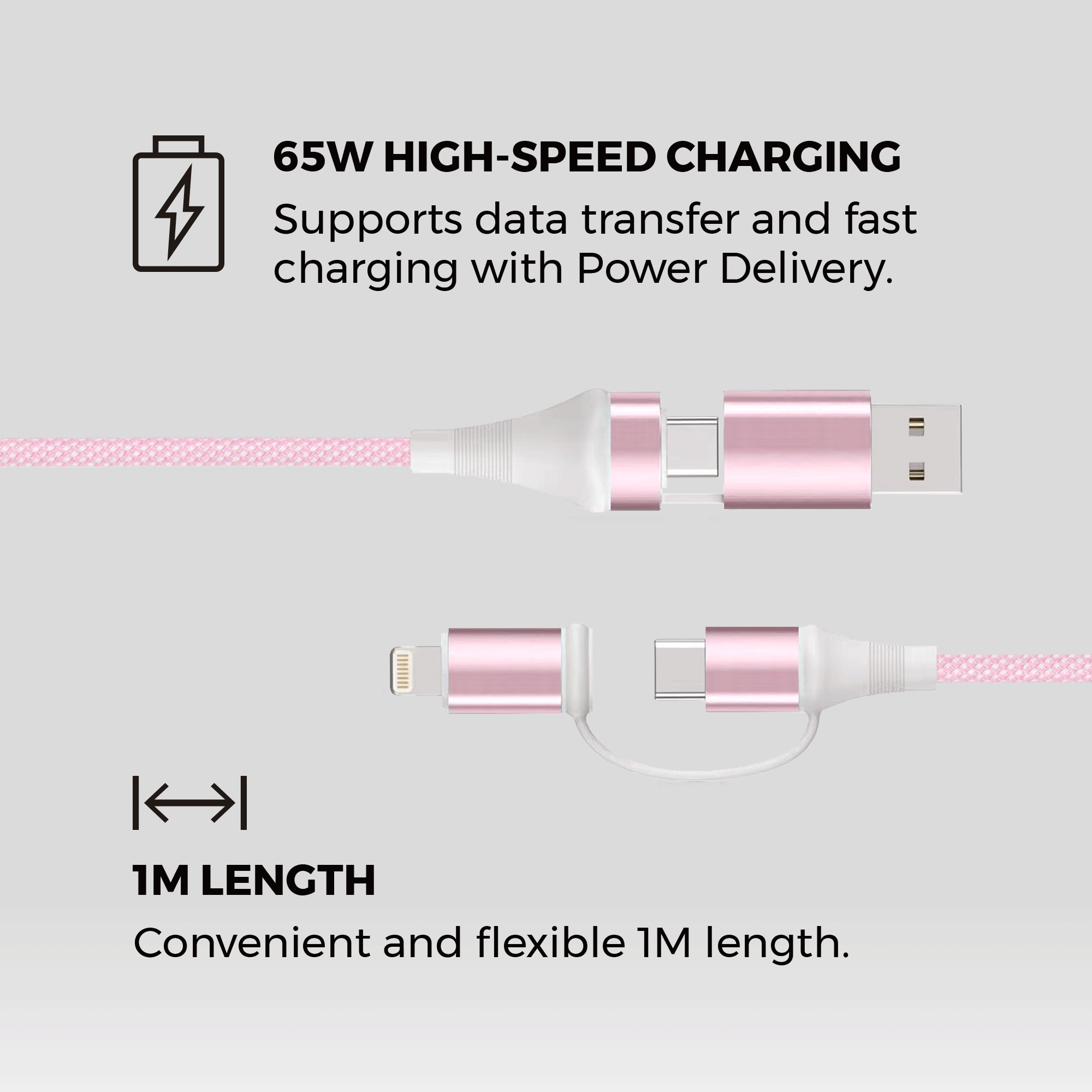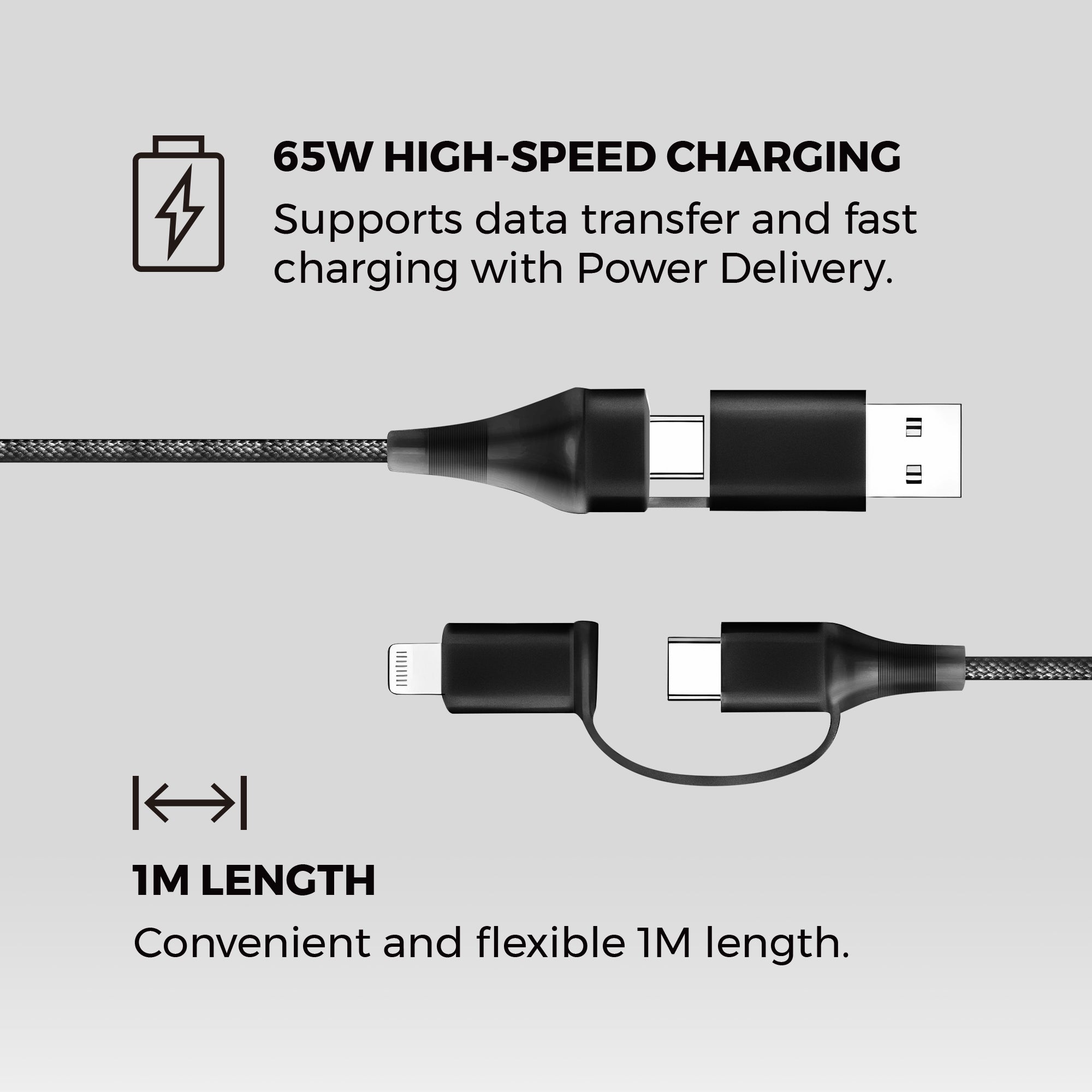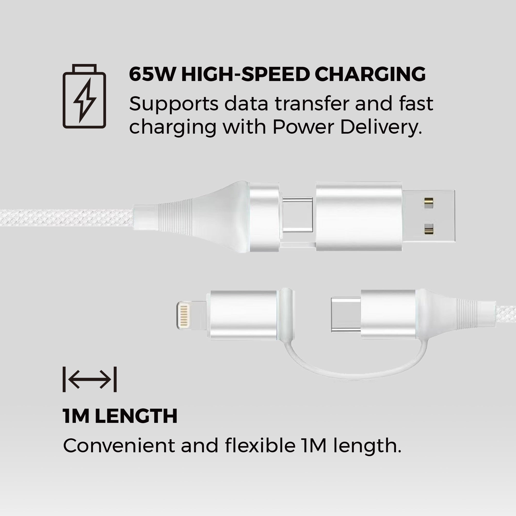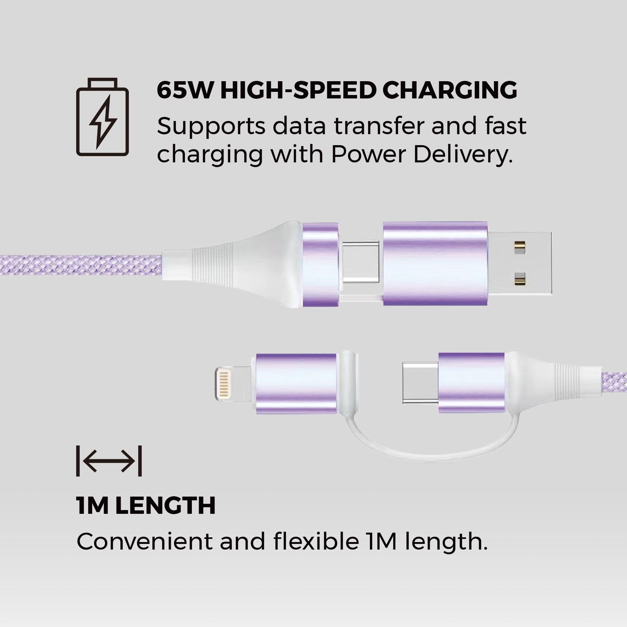 The 4-in-1 cable charges up to 65W. Charging speeds vary depending on your adapter and device.