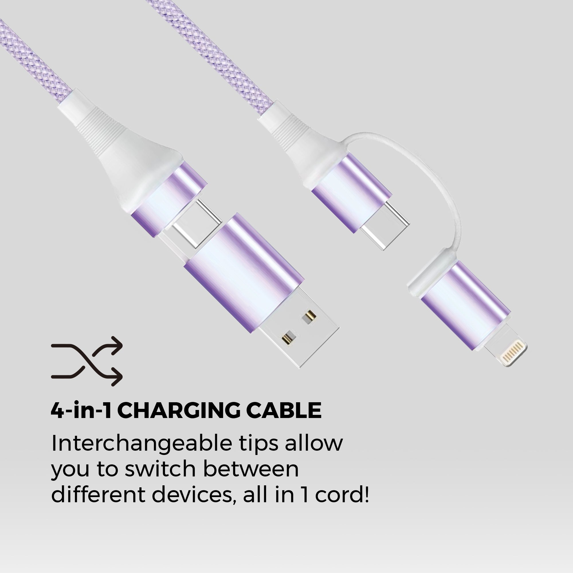 Our 4-in-1 Universal Fast Charging Cable is designed for versatility. With four interchangeable tips, it allows you to switch between devices effortlessly. One connector has both USB-C and Apple Lightning tips, while the other includes USB-A and USB-C compatibility. Plus, it supports data transfer, making it a must-have for busy lifestyles.