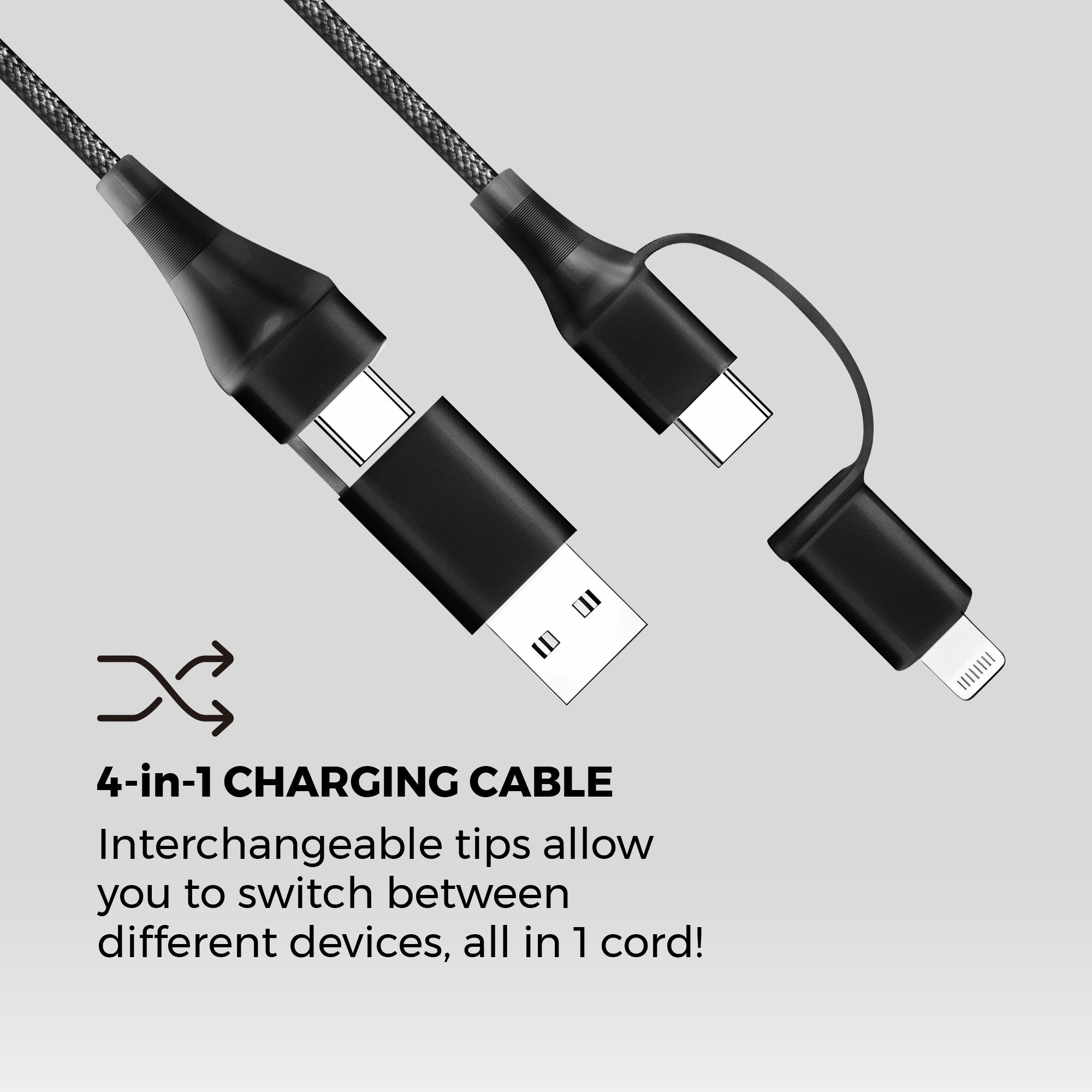 The 4-in-1 charging cable supports the following configurations: USB-C to Apple Lightning, USB-C to USB-A, USB-C to USB-C, and USB-A to Apple Lightning.
