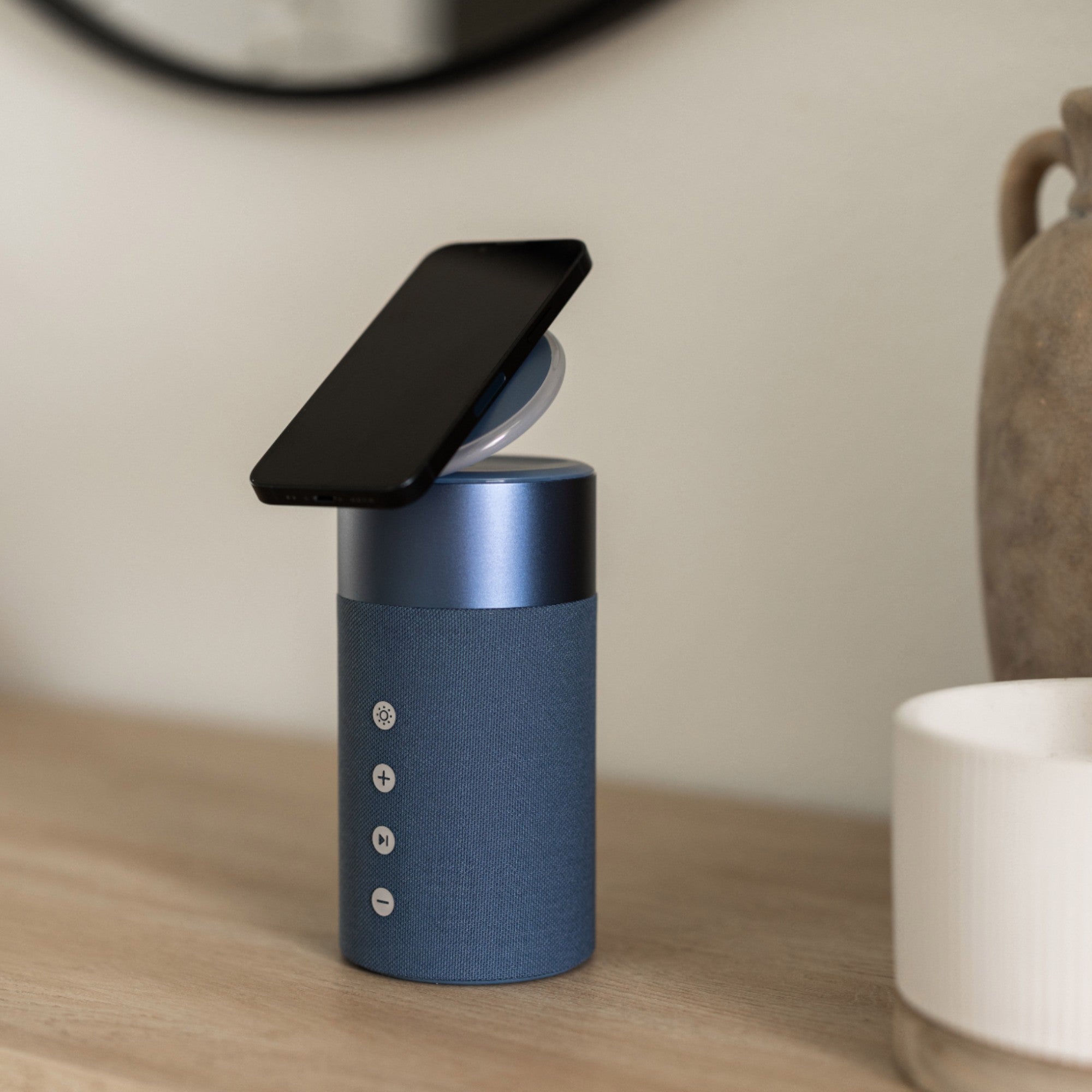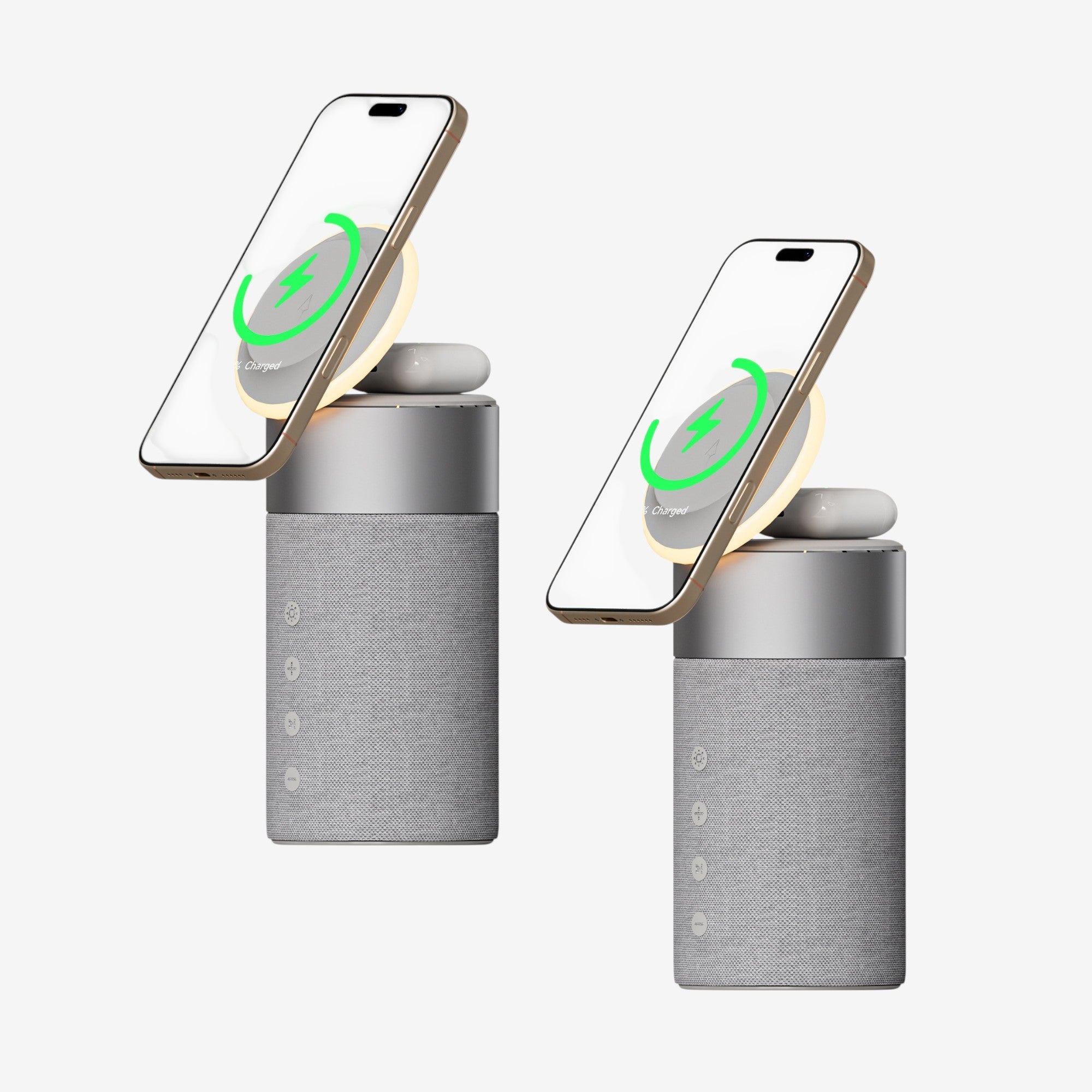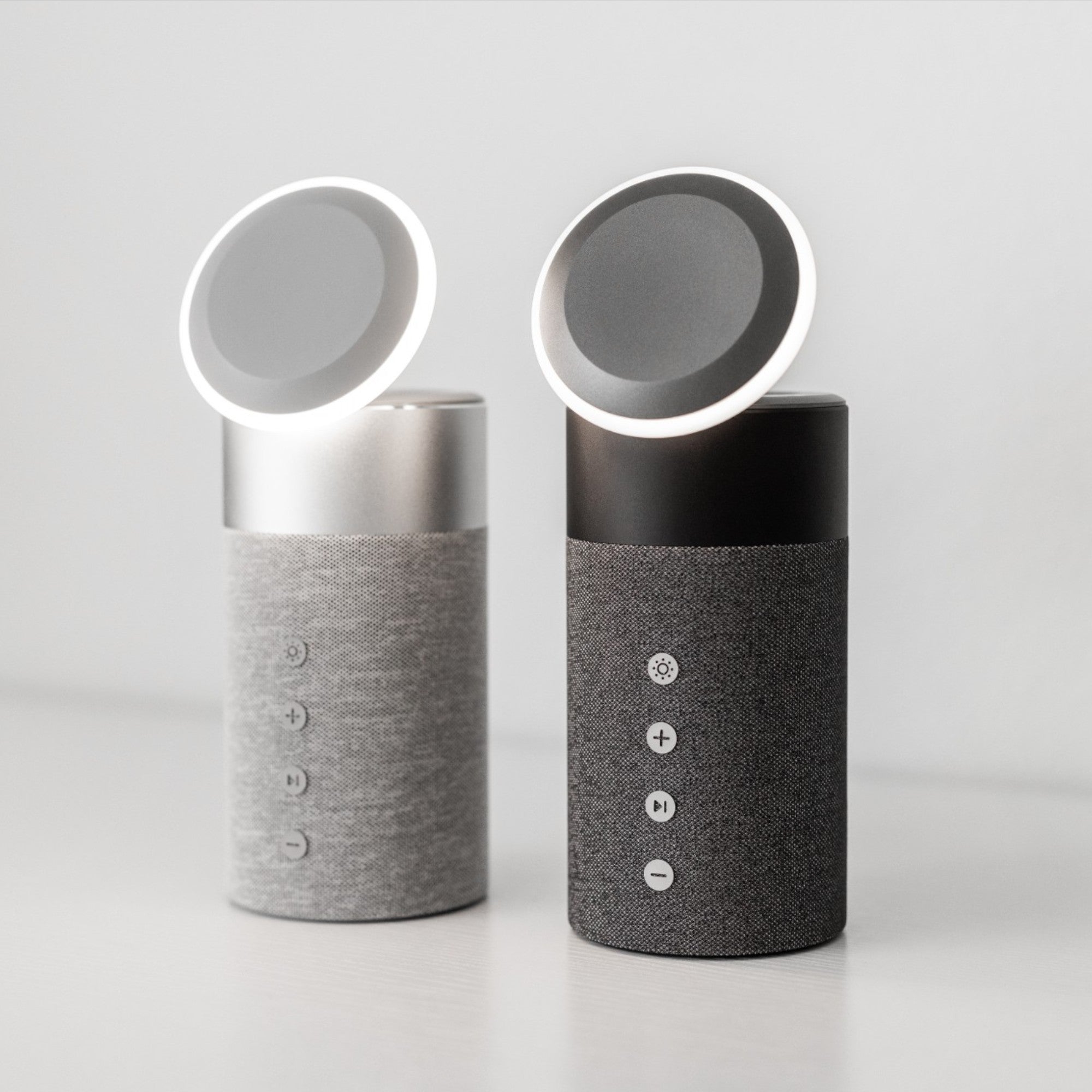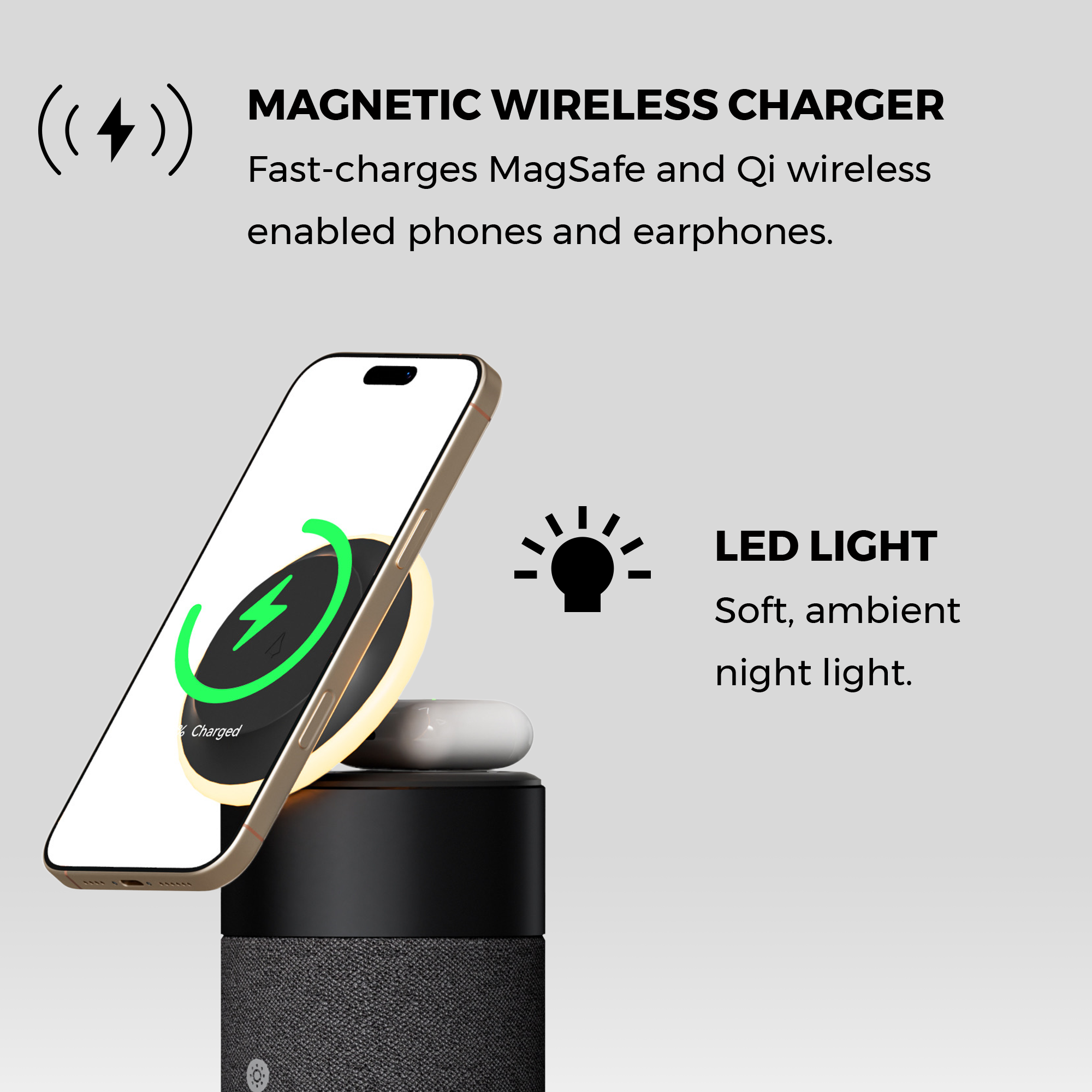 Halo is an all-in-one wireless charger, LED lamp, and Bluetooth speaker. The modern design features a magnetic ring on the front to charge your phone, while the second charging pad on the back will power your AirPods or Buds. It also comes equipped with a soft, built-in light and wireless speaker to play your favourite music.