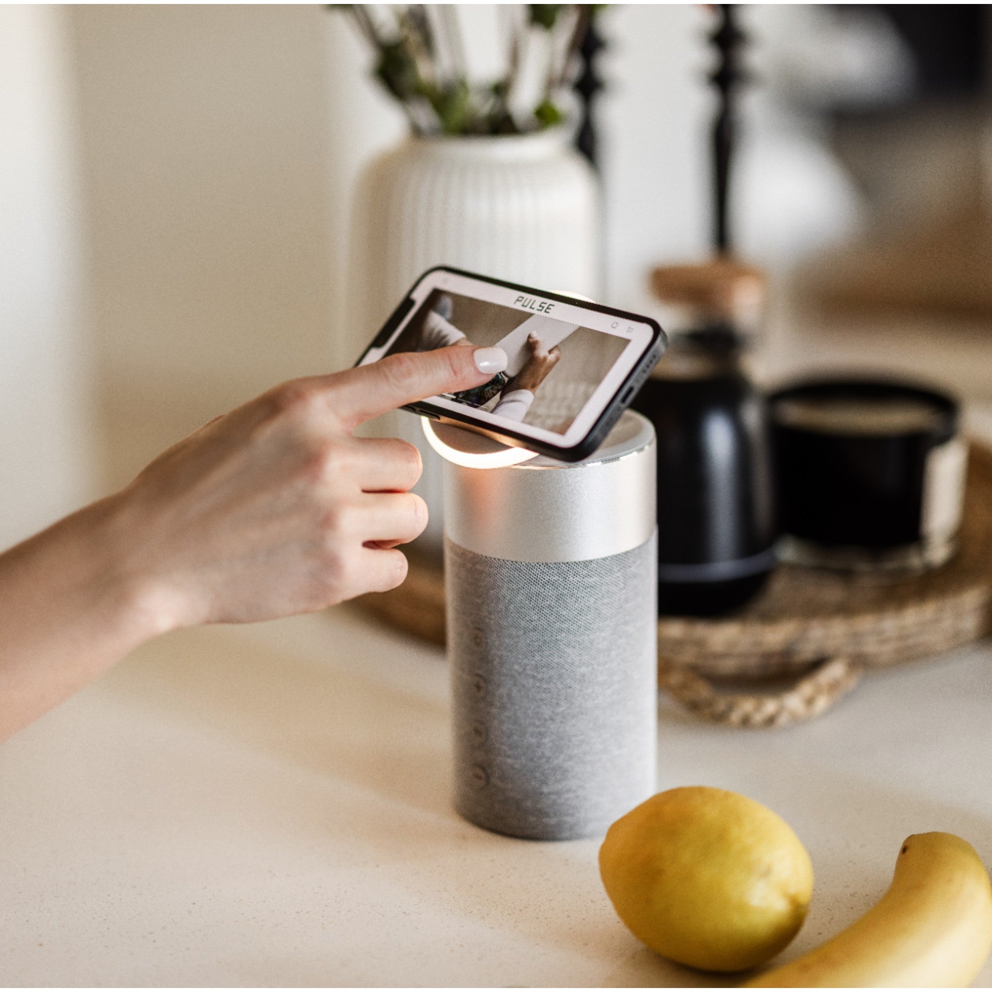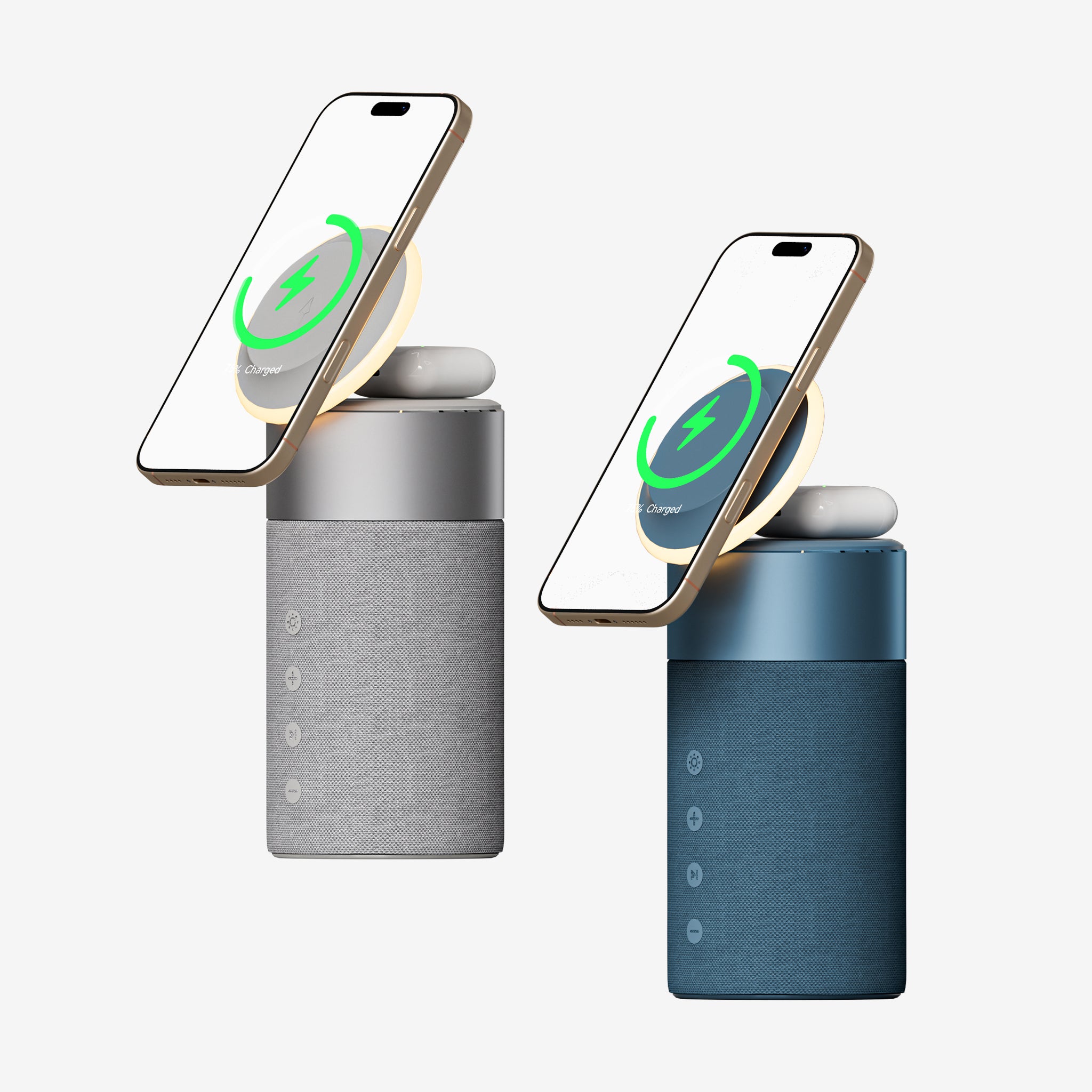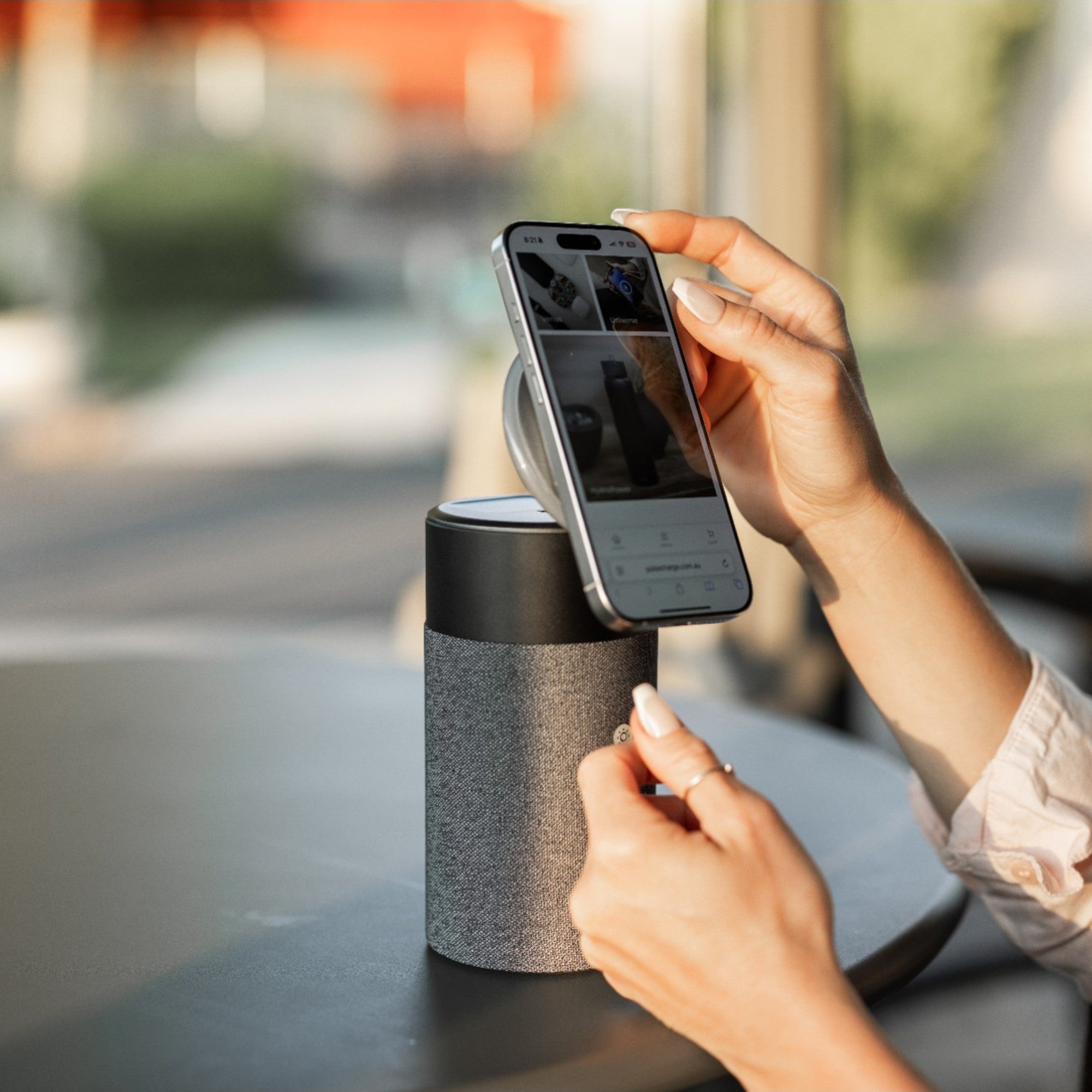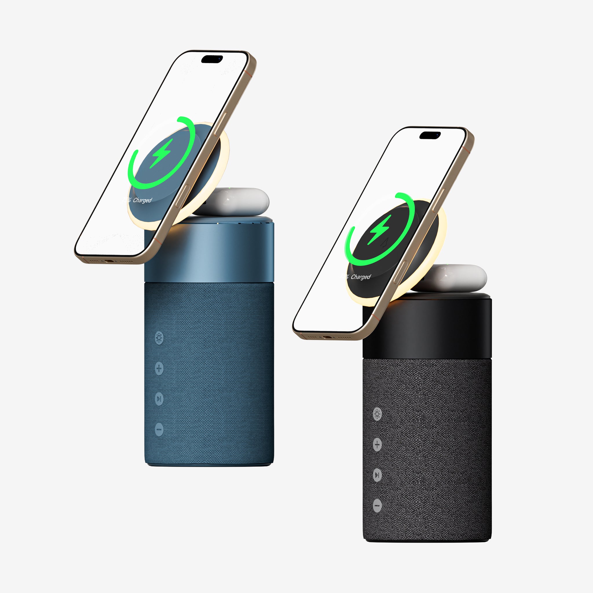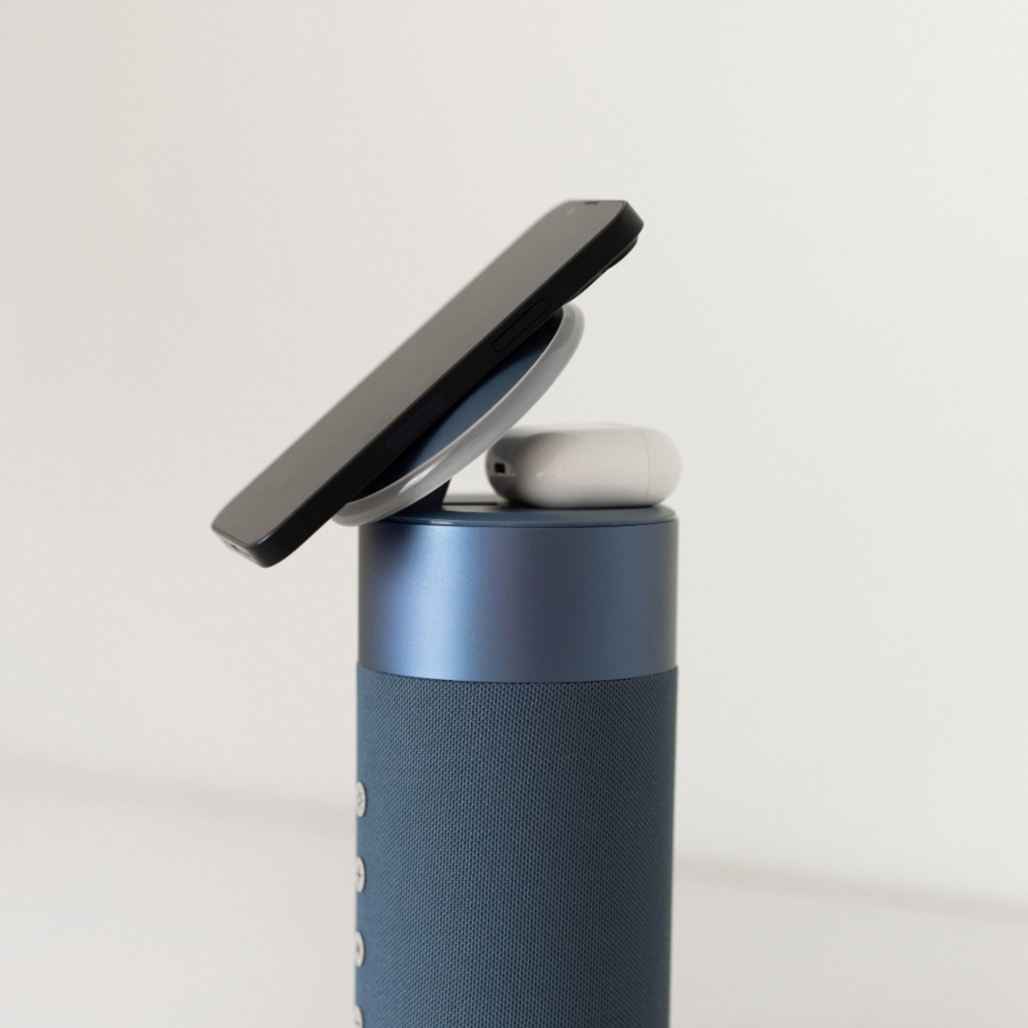 Halo is an all-in-one wireless charger, LED lamp, and Bluetooth speaker. The modern design features a magnetic ring on the front to charge your phone, while the second charging pad on the back will power your AirPods or Buds. It also comes equipped with a soft, built-in light and wireless speaker to play your favourite music.