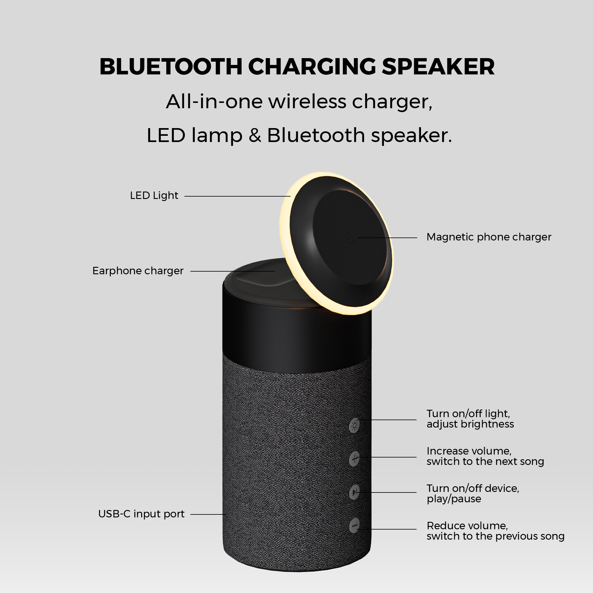 Halo will charge your phone and earphones when it's plugged into a power source. The magnetic wireless charging ring on the front will charge your phone and the charging pad on the back will charge your earphones. The LED light and Bluetooth speaker settings can be used while Halo is plugged-in (and charging your devices), or they can be used portably, on-the-go.