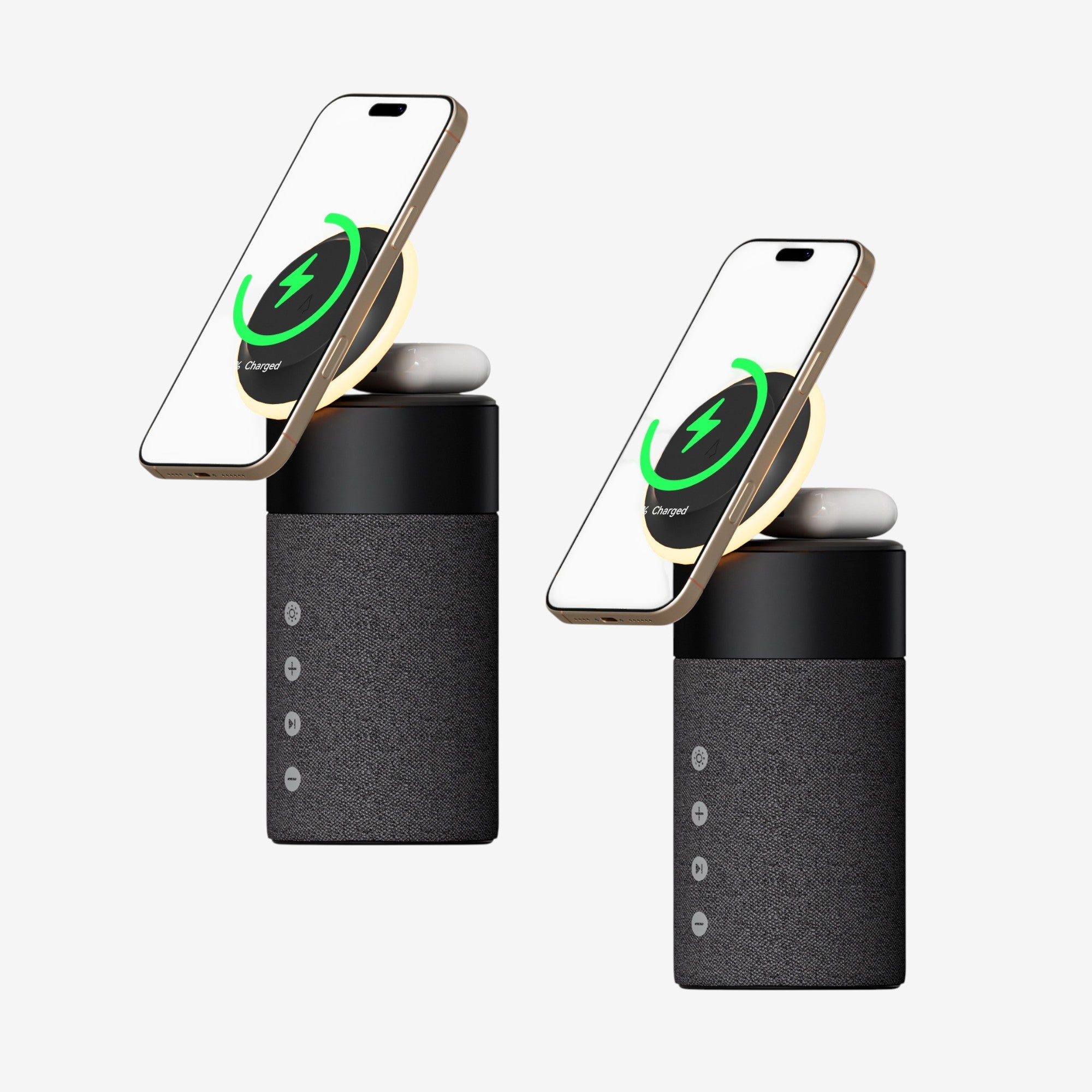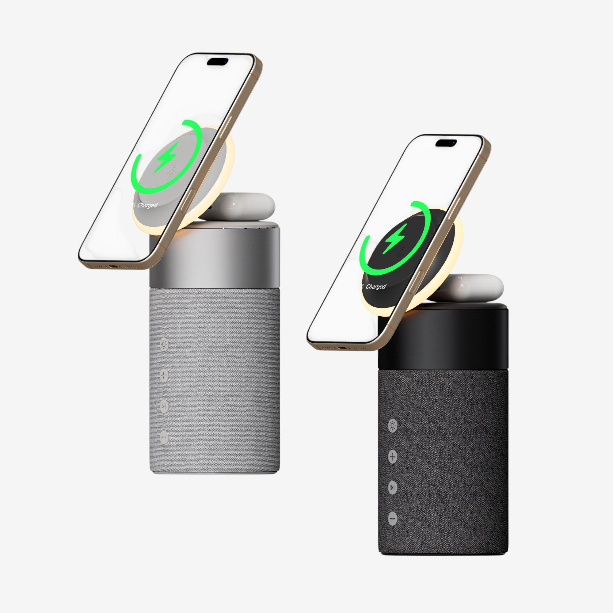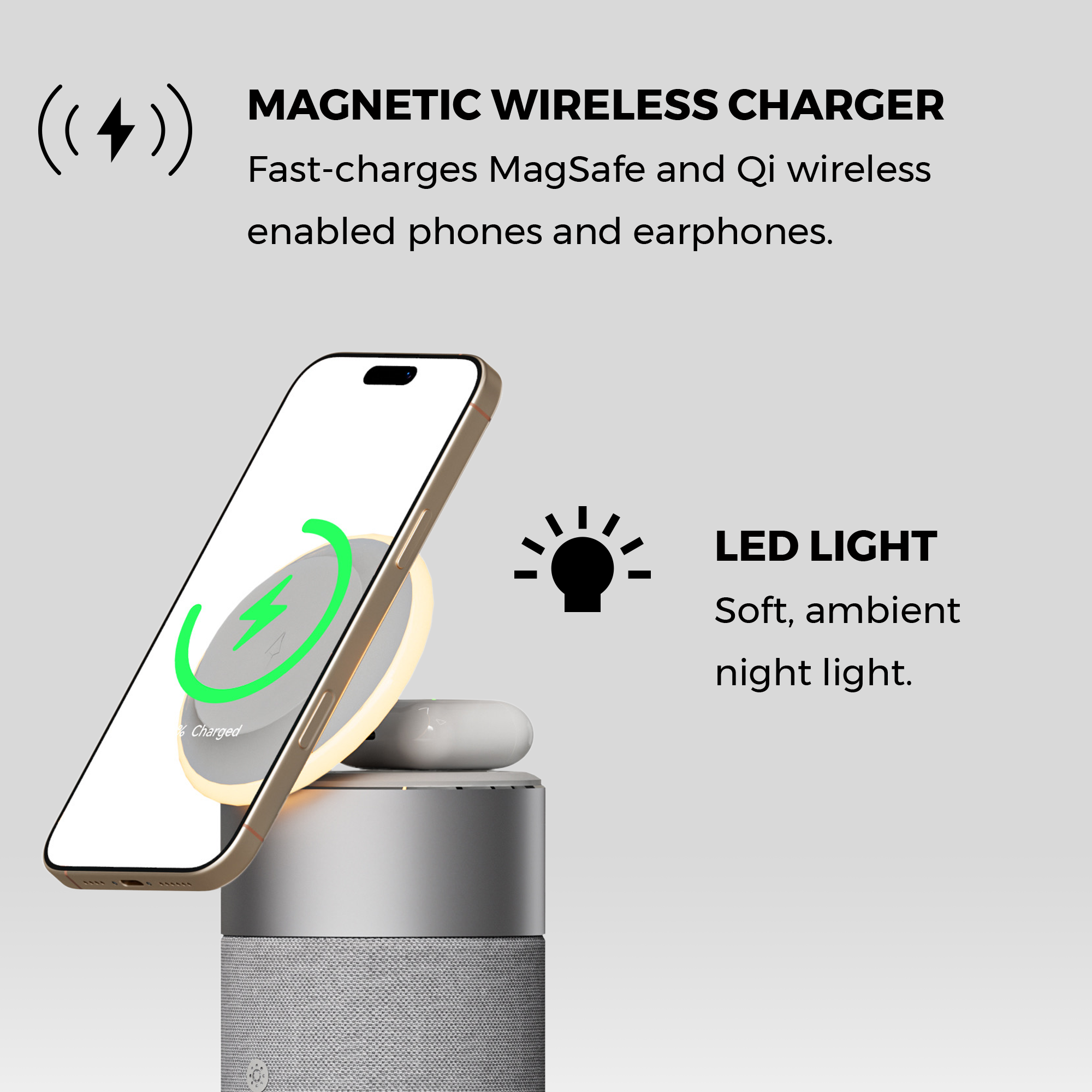 Halo is an all-in-one wireless charger, LED lamp, and Bluetooth speaker. The modern design features a magnetic ring on the front to charge your phone, while the second charging pad on the back will power your AirPods or Buds. It also comes equipped with a soft, built-in light and wireless speaker to play your favourite music.
