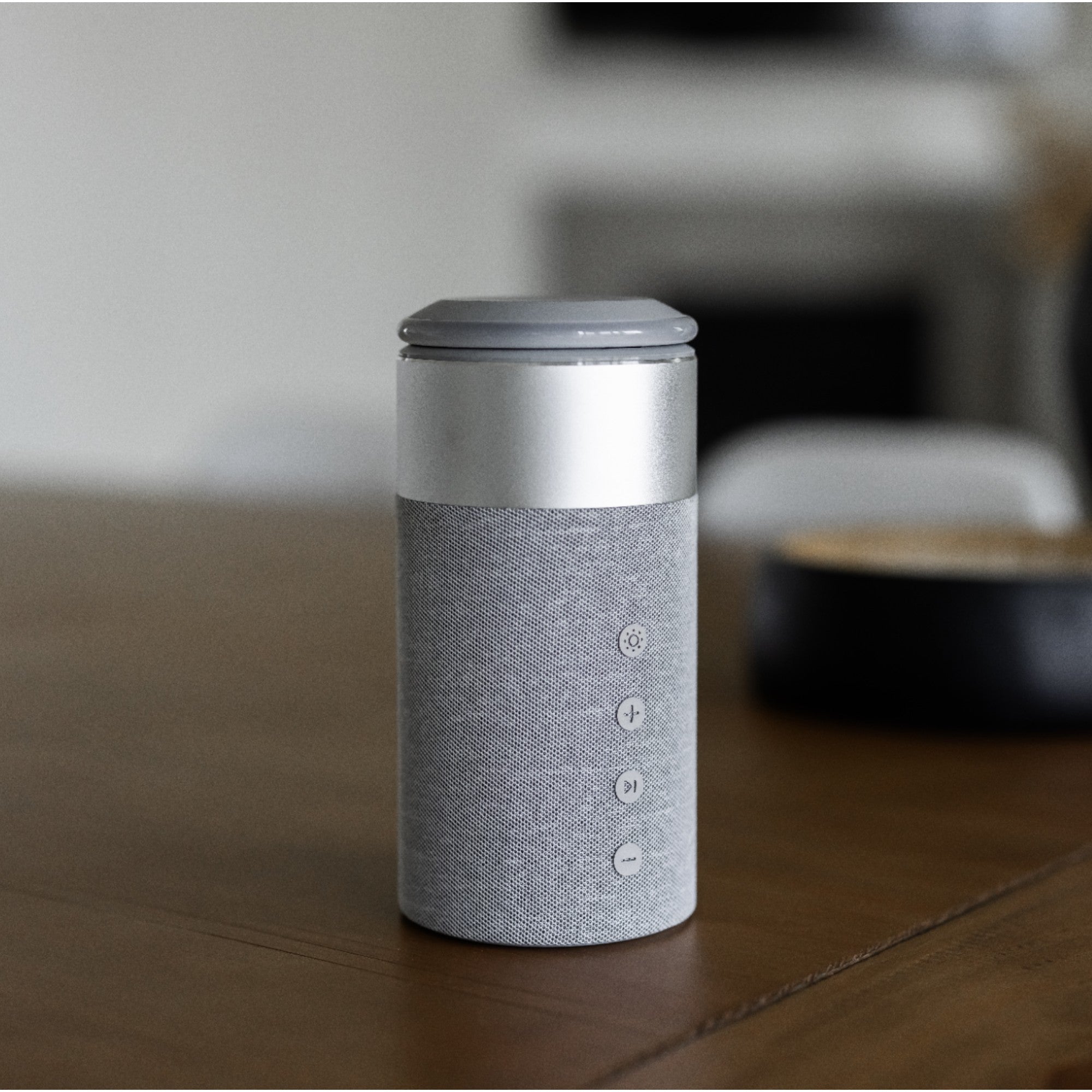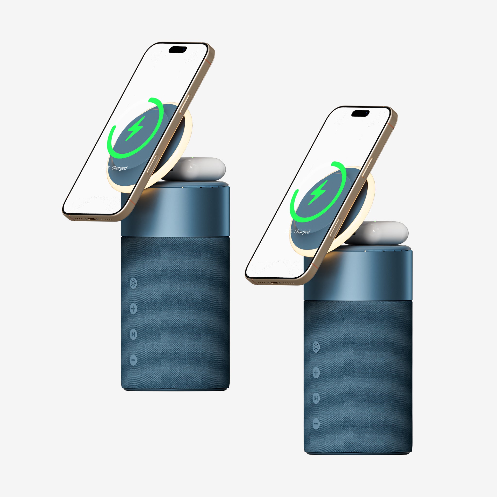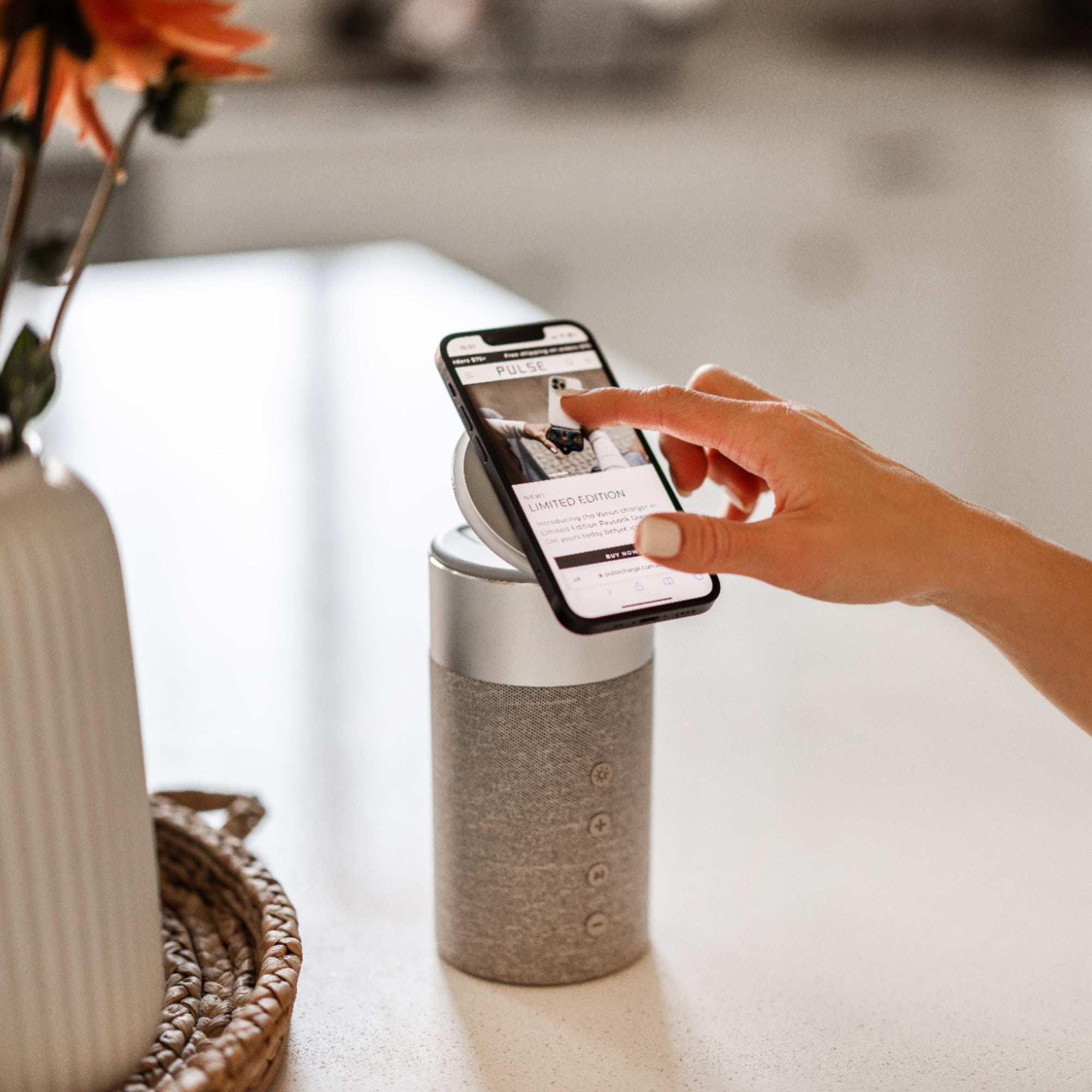 Halo is an all-in-one wireless charger, LED lamp, and Bluetooth speaker. The modern design features a magnetic ring on the front to charge your phone, while the second charging pad on the back will power your AirPods or Buds. It also comes equipped with a soft, built-in light and wireless speaker to play your favourite music.