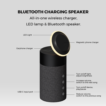 Halo is an all-in-one wireless charger, LED lamp, and Bluetooth speaker. The modern design features a magnetic ring on the front to charge your phone, while the second charging pad on the back will power your AirPods or Buds. It also comes equipped with a soft, built-in light and wireless speaker to play your favourite music.