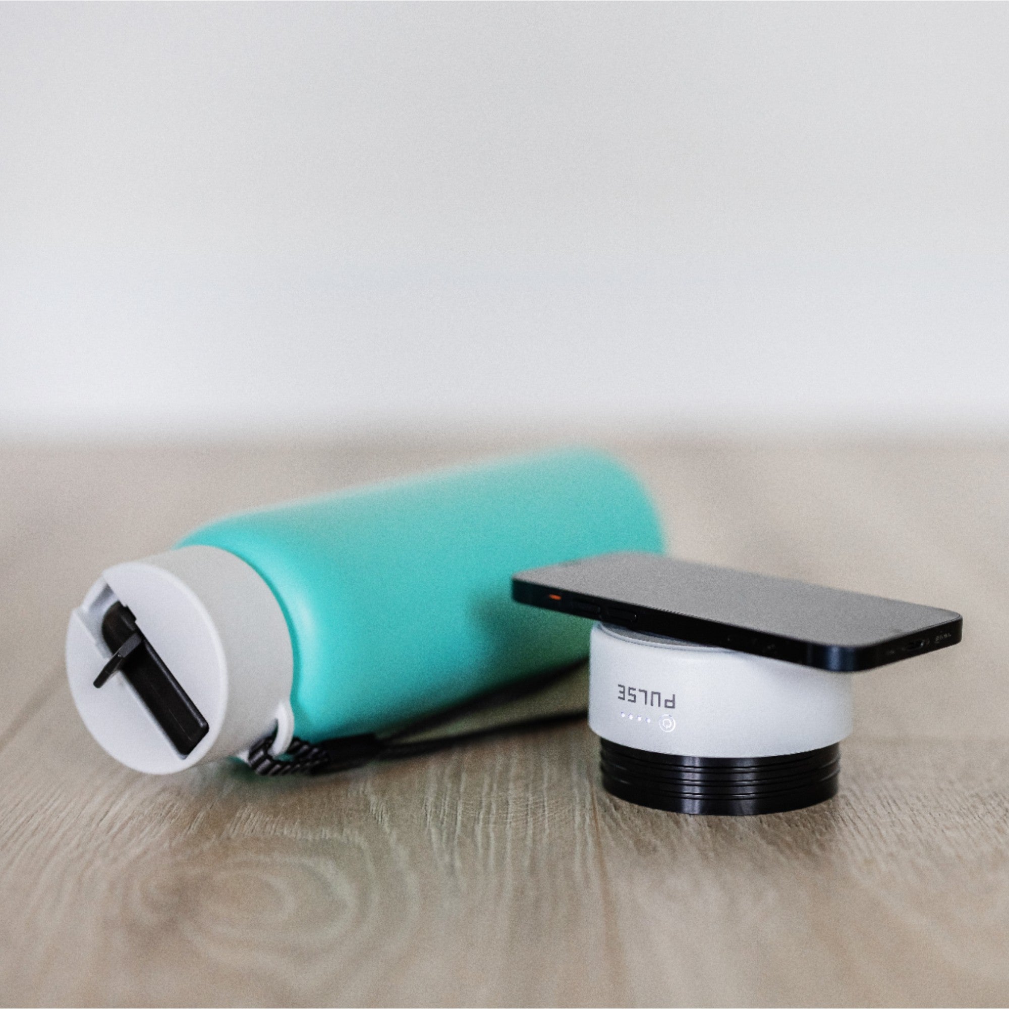 Store the included USB-A to USB-C charging cable at the base of the bottle, above the power bank.