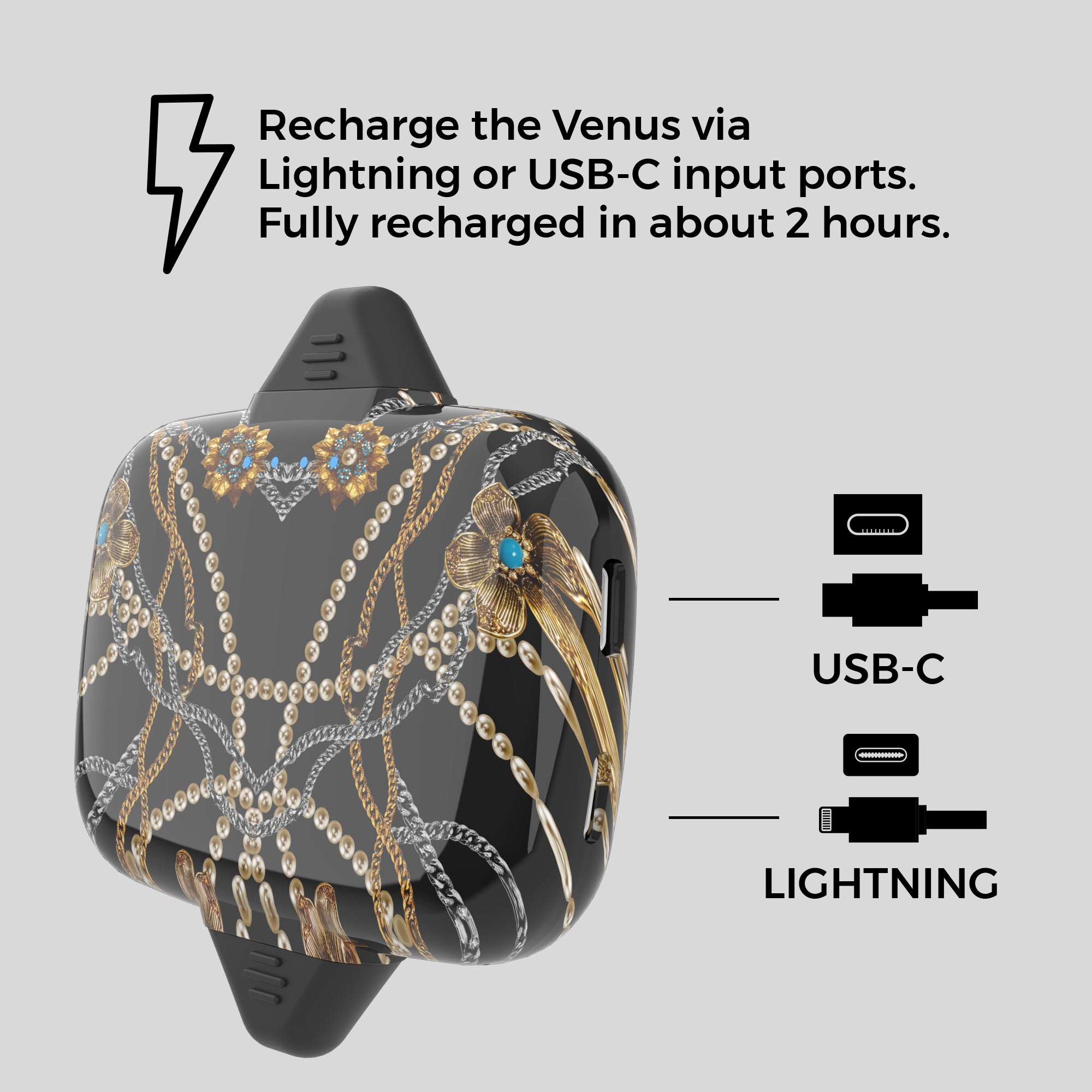 For an even more convenient way to charge, the Venus has pass-through technology. This means that you can recharge your Venus and charge your device at the same time!