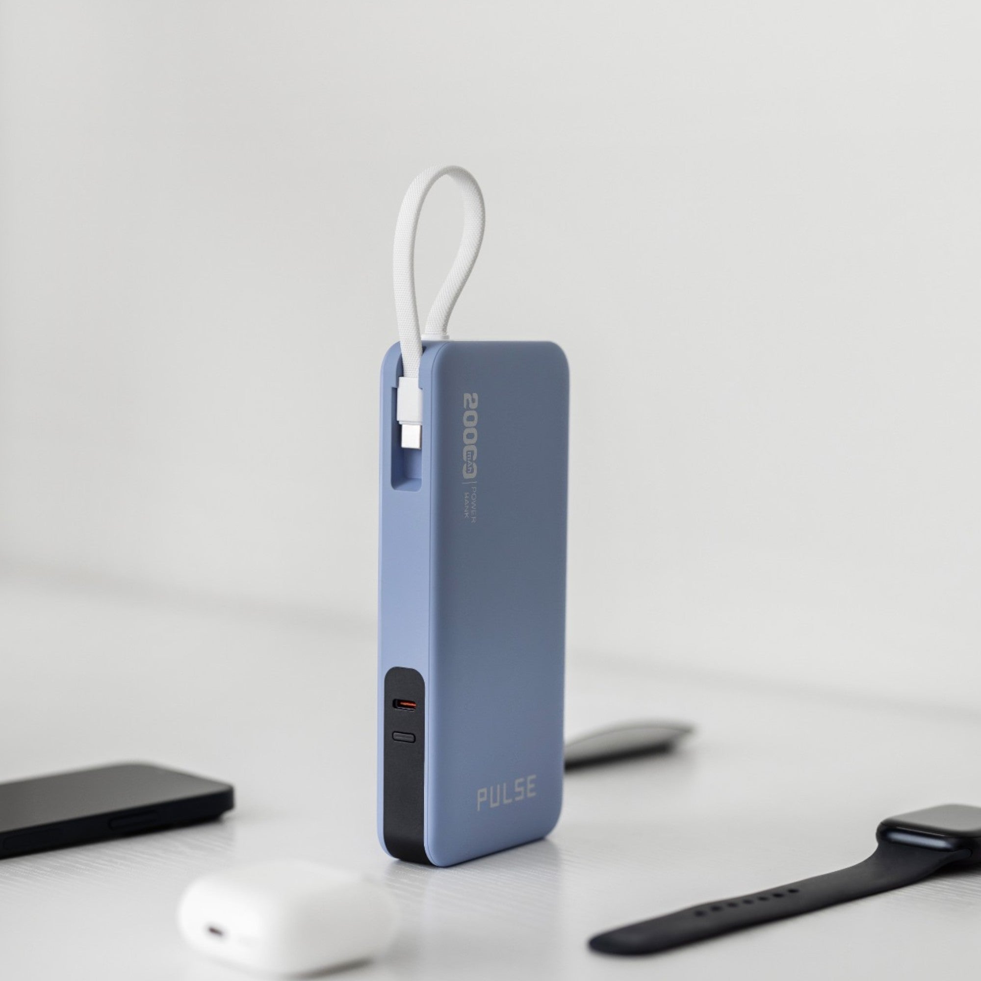 Lightning is a powerful and portable power bank. Compact and lightweight, it features a high-capacity 20,000mAh battery, built-in USB-C cable, and USB-C/USB-A ports. It also charges with lightning speed by way of 65W power delivery.
