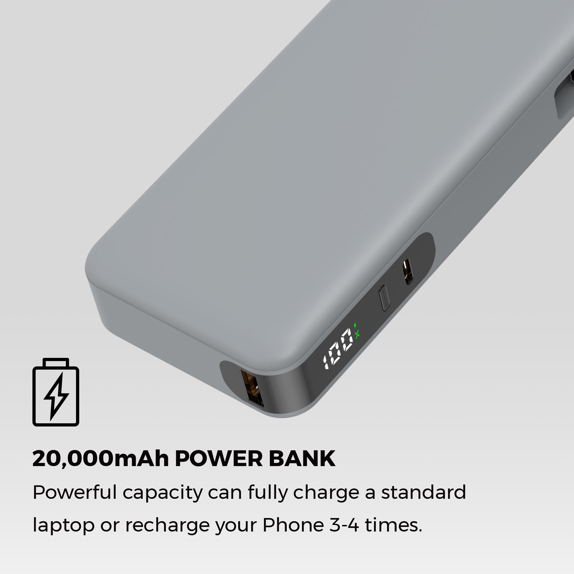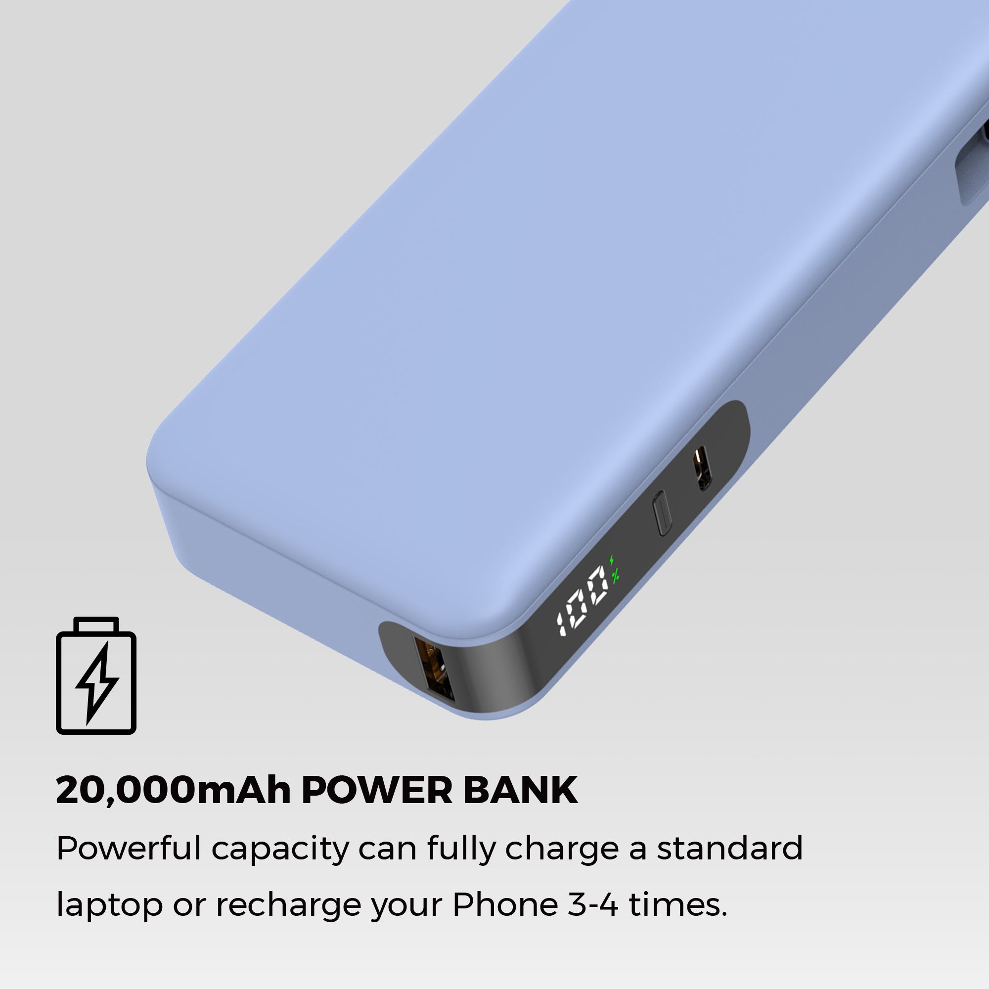 High-capacity and powerful 20,000mAh battery will charge a standard smartphone 3-5 times or a standard laptop 1-3 times.