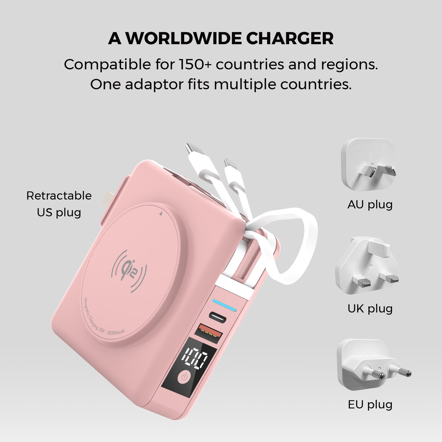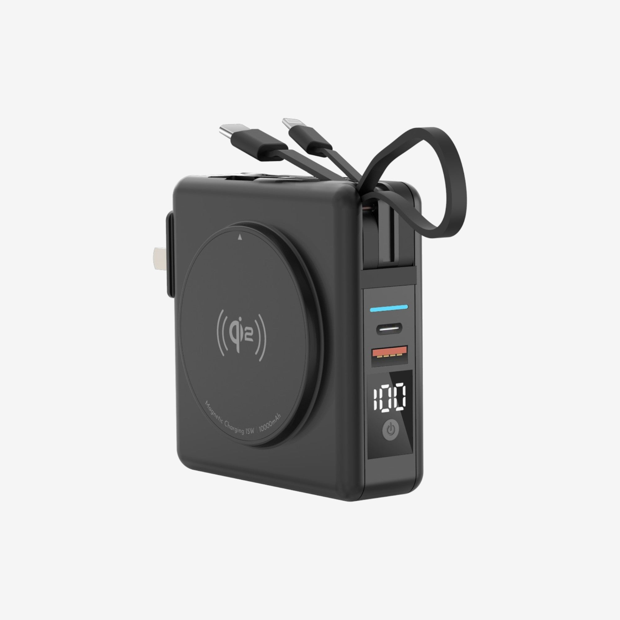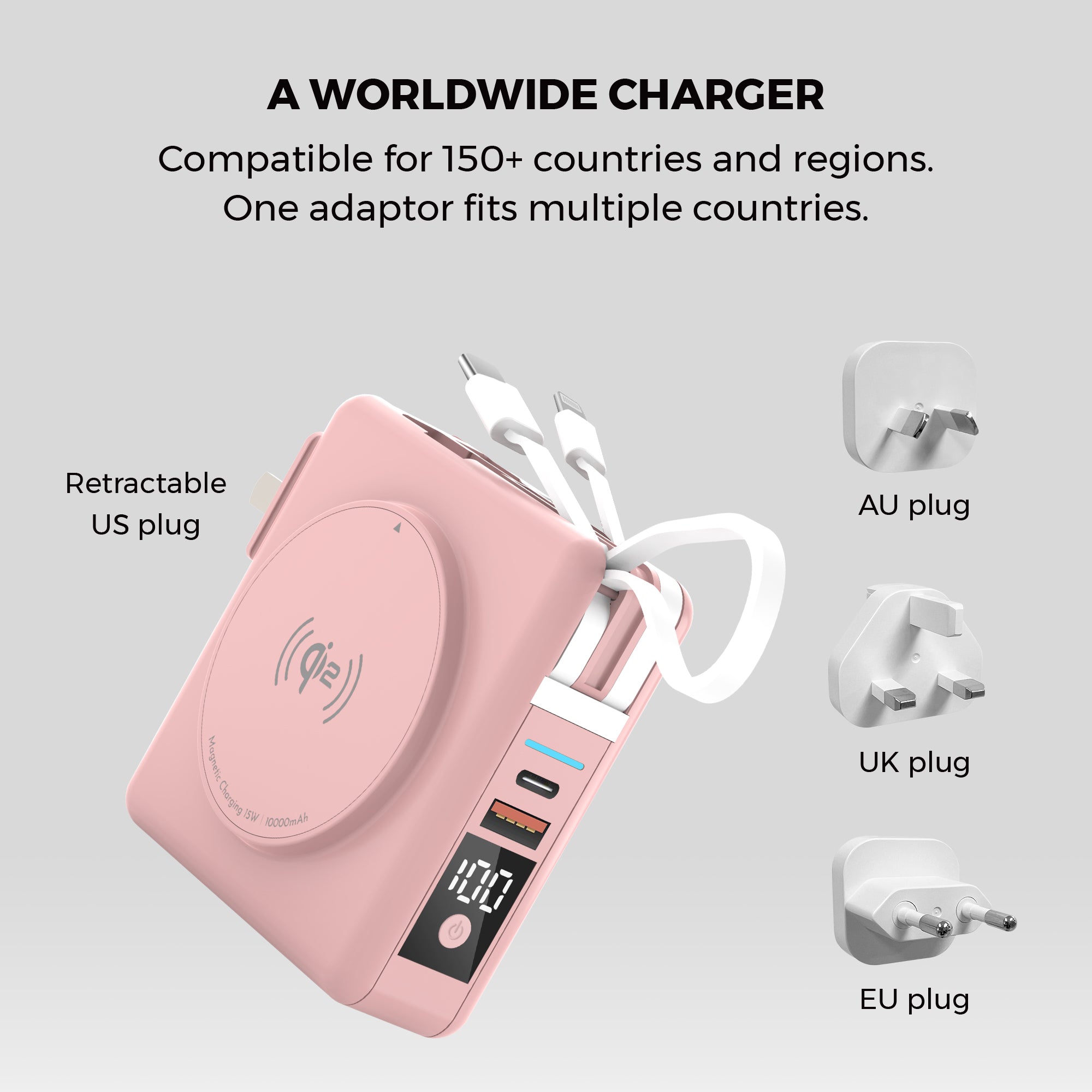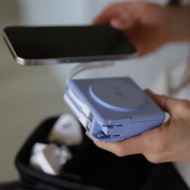 The magnetic ring on the side includes Qi2 MagSafe fast wireless charging. Meanwhile the other side includes a kickstand and retractable cradle for easy viewing. You can also travel the world effortlessly with a retractable US plug and included adaptors for AU, UK, and EU sockets.