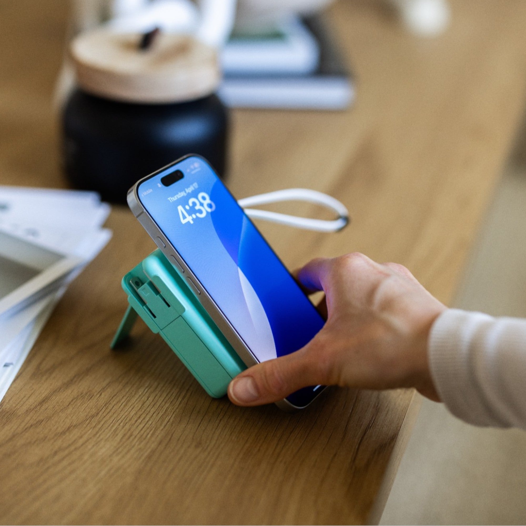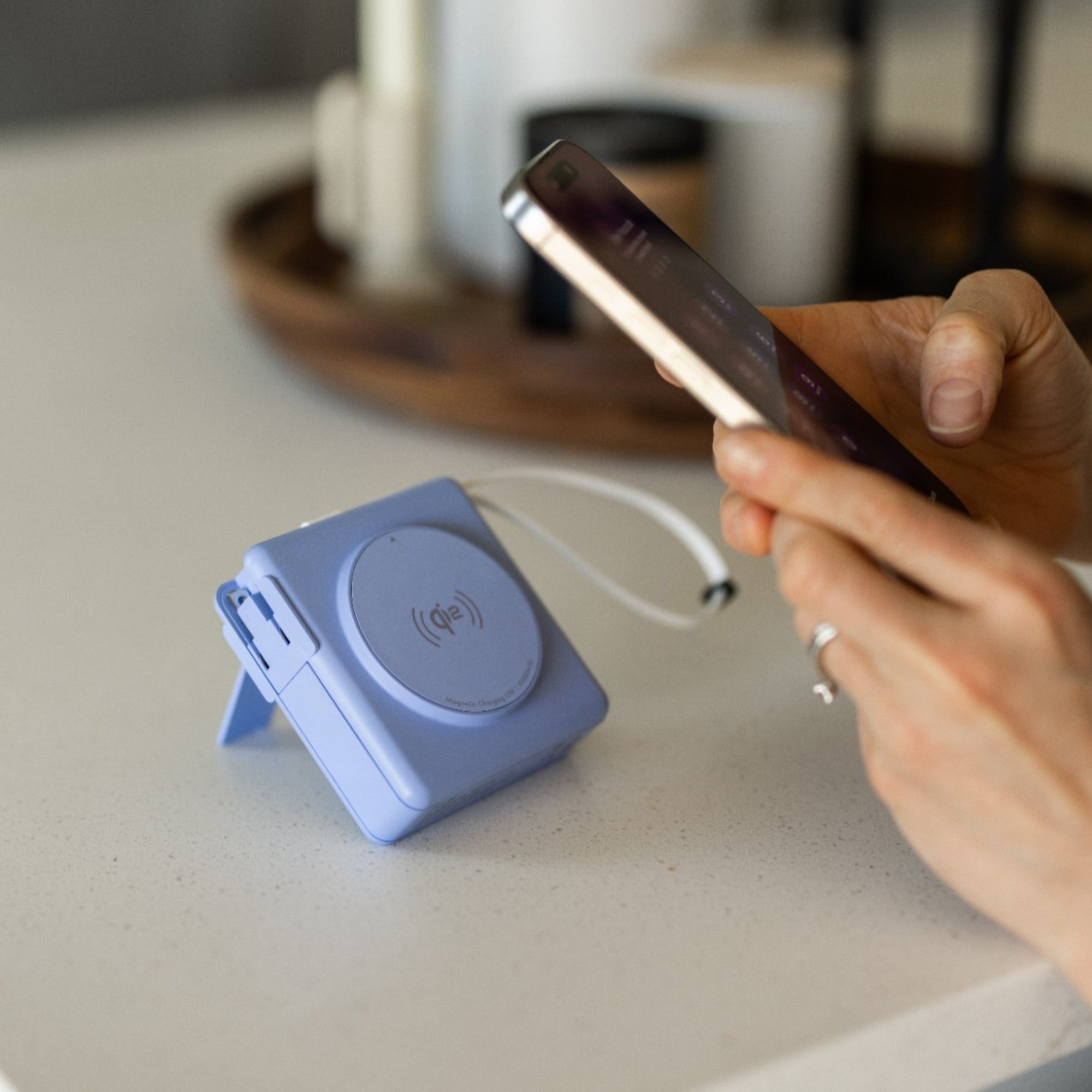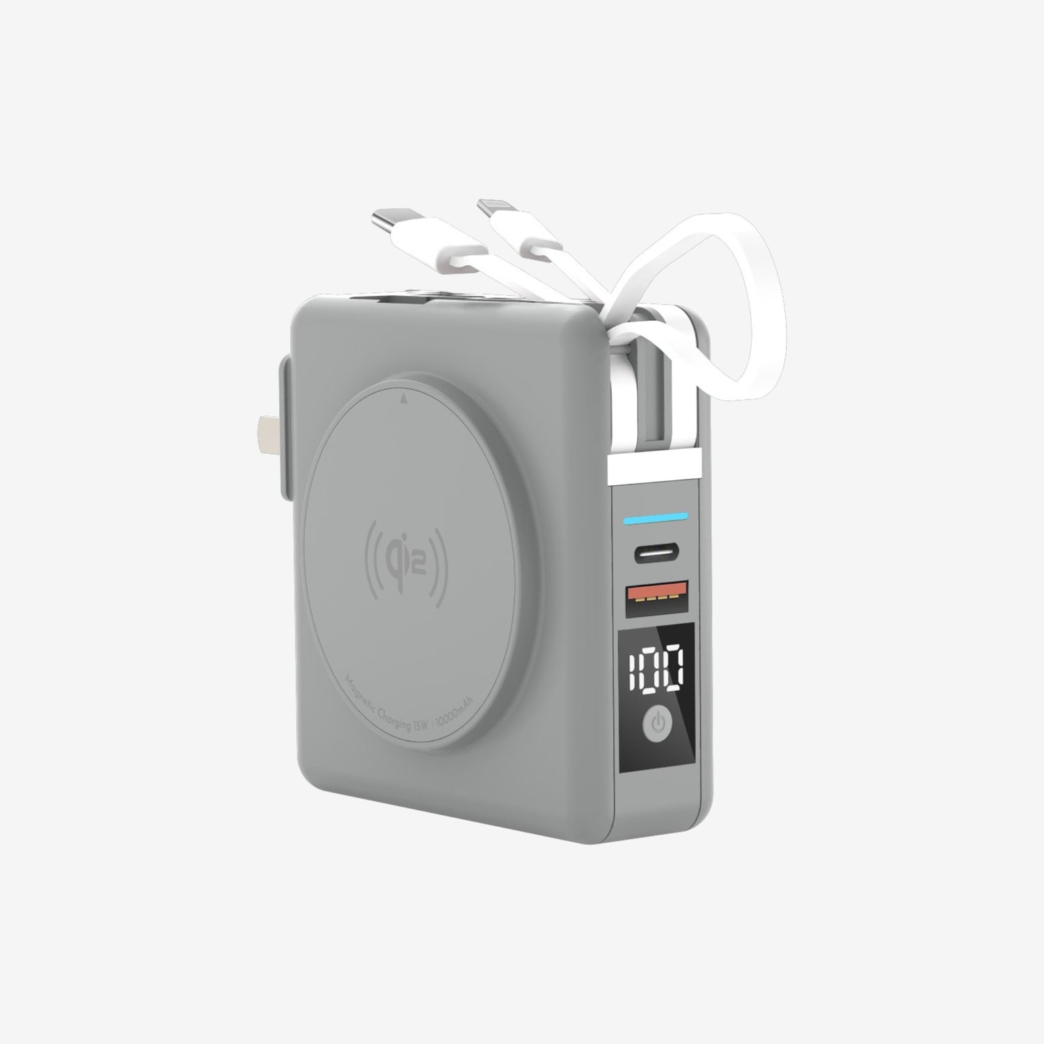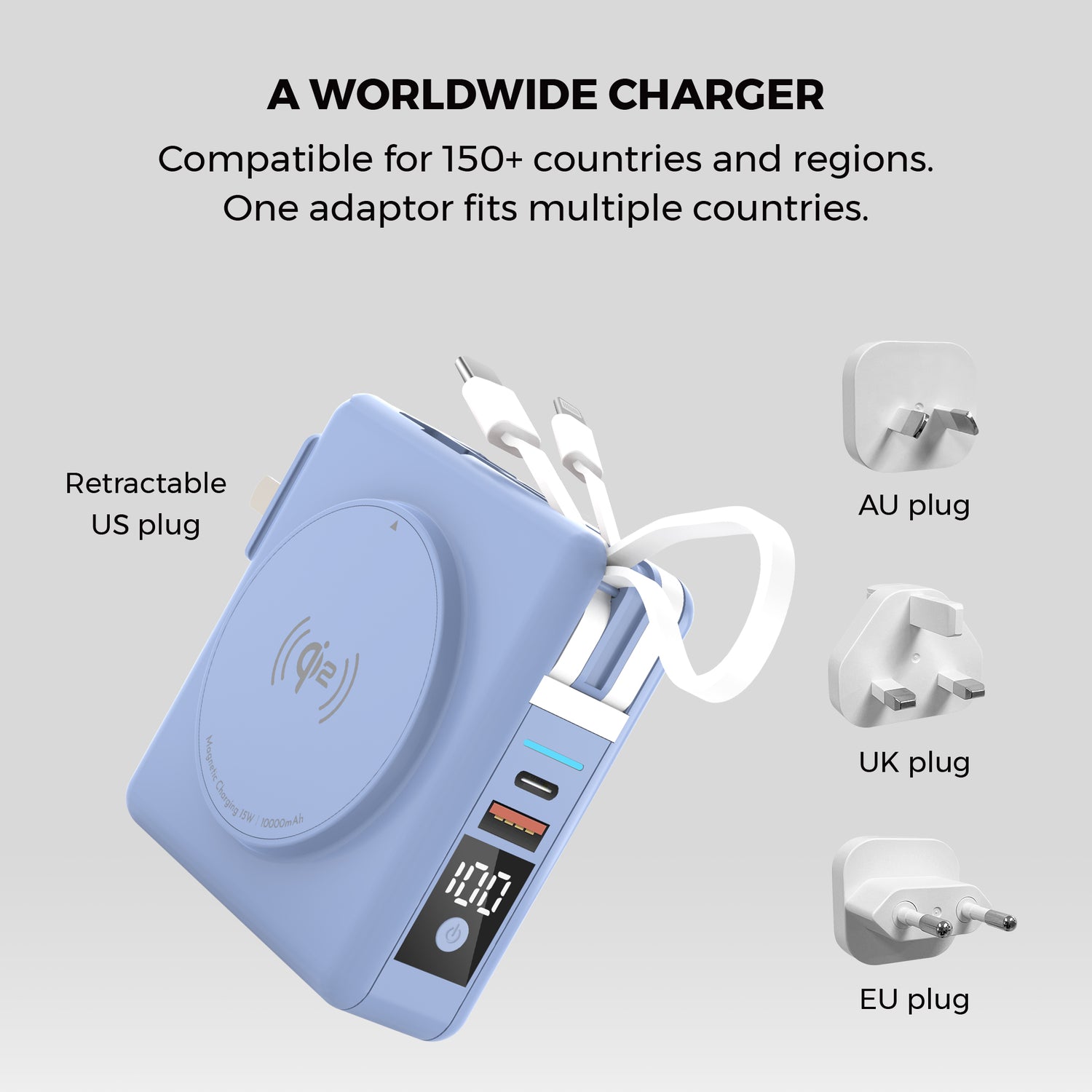 The magnetic ring on the side includes Qi2 MagSafe fast wireless charging. Meanwhile the other side includes a kickstand and retractable cradle for easy viewing. You can also travel the world effortlessly with a retractable US plug and included adaptors for AU, UK, and EU sockets.