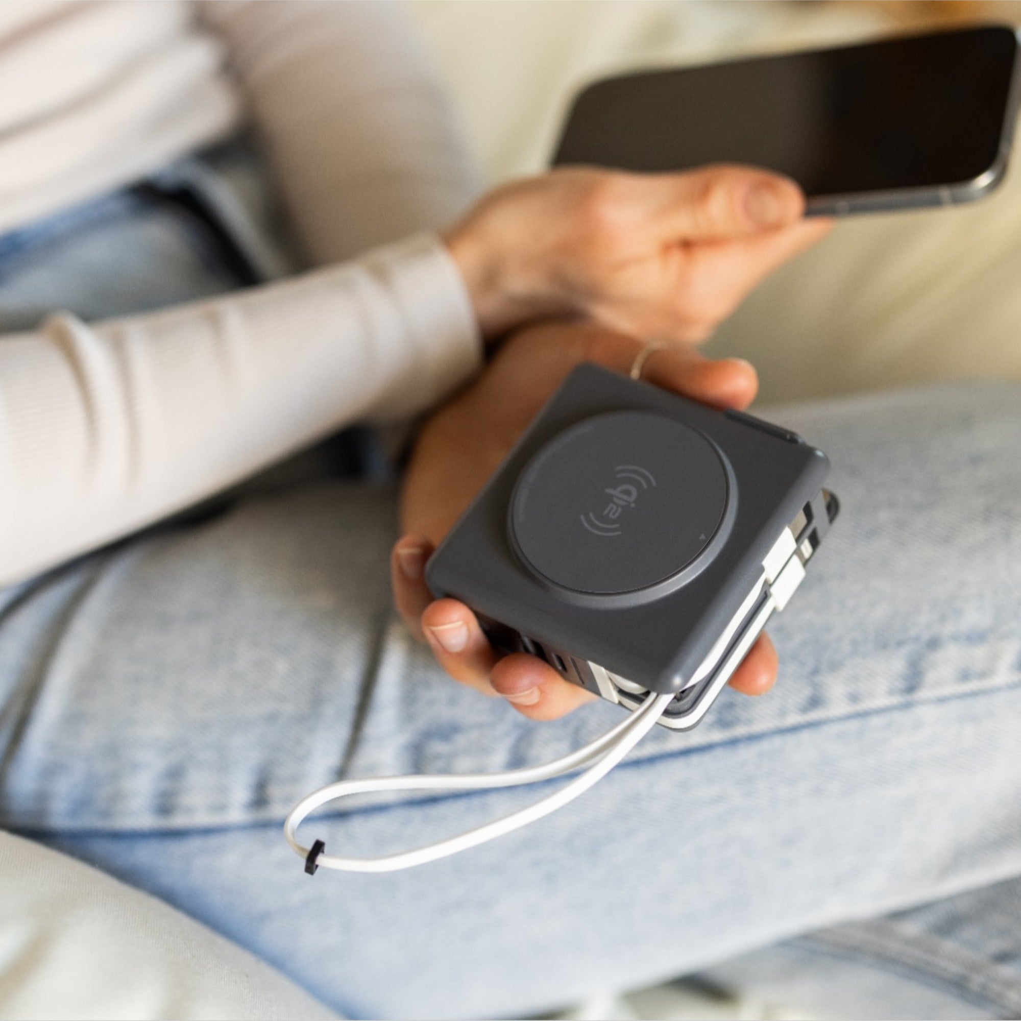 The Universe is a portable, external power bank. It can power your devices by using the built-in cords, attaching your own charging cables, or by using the magnetic wireless charging ring on the side.