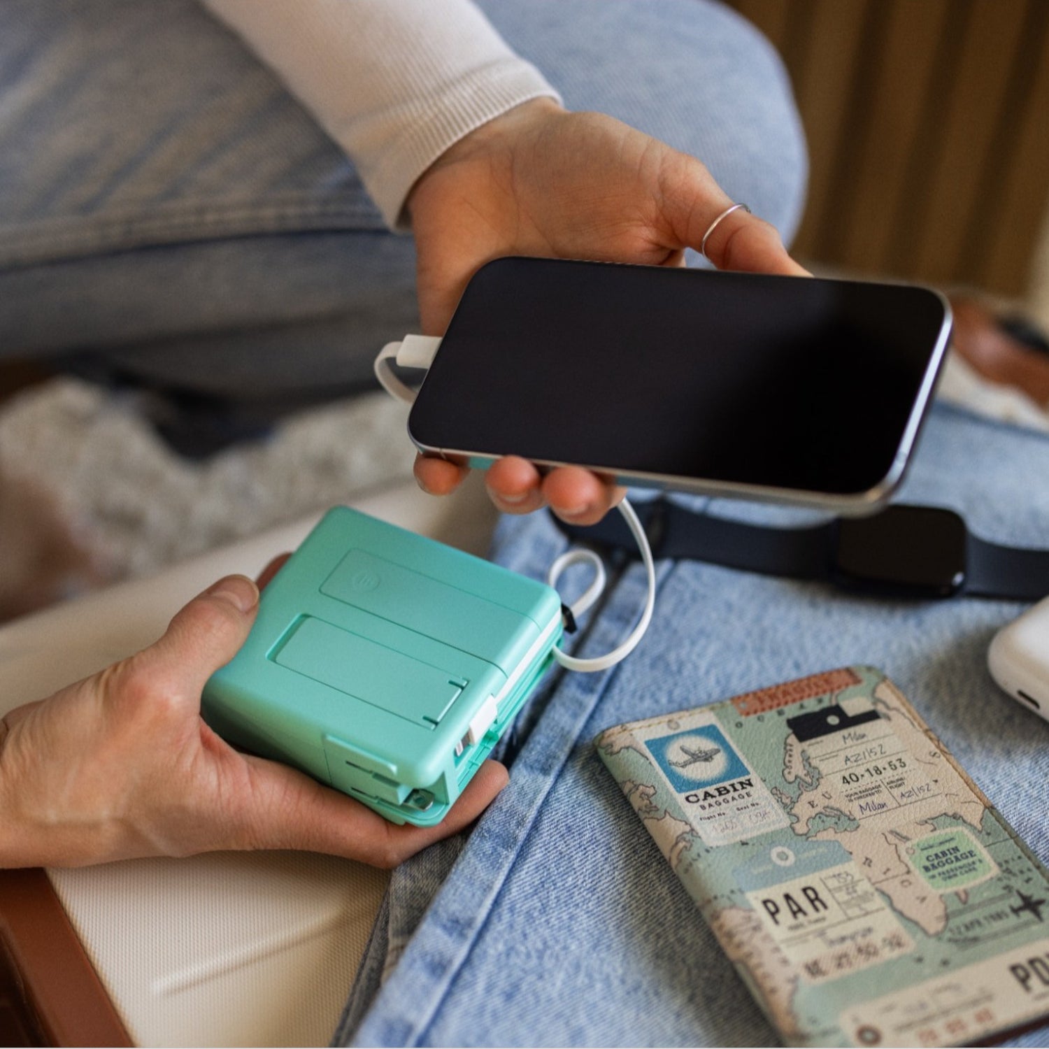 Universe is our 5-in-1 portable charger that keeps you powered everywhere you go. It has a powerful 10,000mAh battery with two built-in charging cables. One cable charges Apple devices and the other, extendable cable charges USB-C/Android devices. It also includes a Lightning extension cable for Apple users.