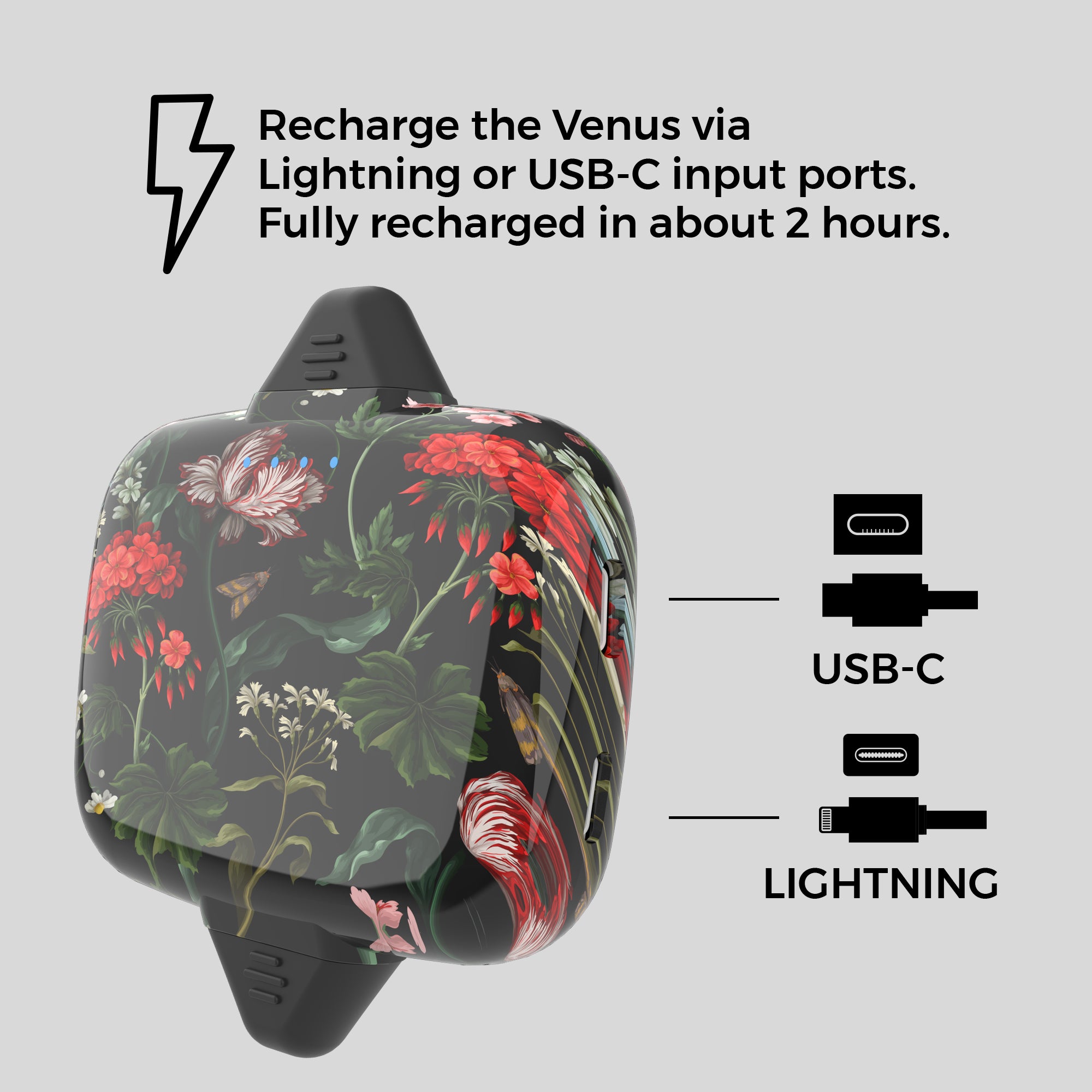For an even more convenient way to charge, the Venus has pass-through technology. This means that you can recharge your Venus and charge your device at the same time!